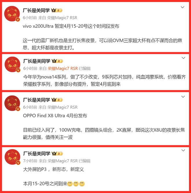 还有就是OPPO Find X8 Ultra,OPPO的年度影像旗舰将于4月发布,凭借“双潜望长焦+2K直屏”的组合,剑指高端市场。